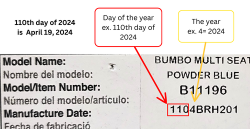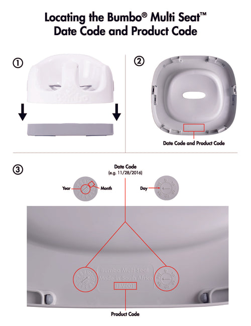Please use the below image to locate date code and product code on your Bumbo Multi Seat.