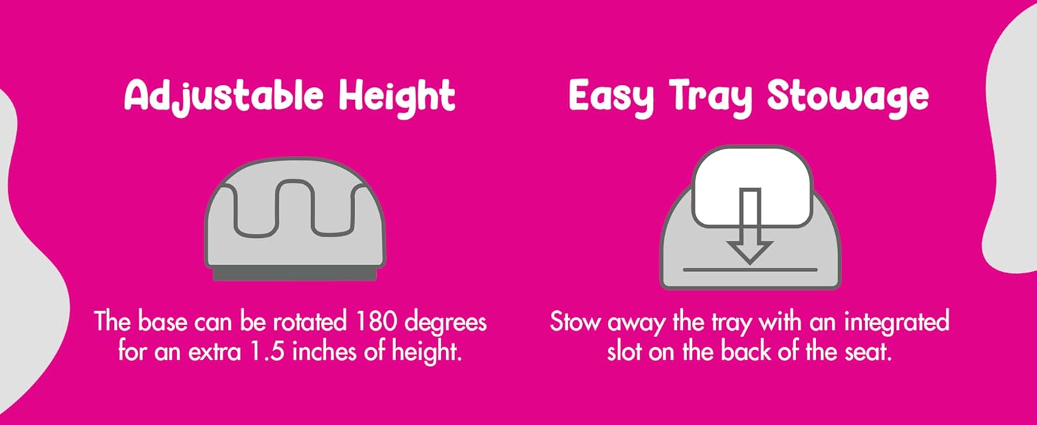 The Bumbo® Multi Seat is designed for babies and toddlers who can already sit up unaided. It comes standard with a feeding and play tray that stows in the back of the seat, and has several grow-with-me features, making it ideal for use from 6 months to 3 years. The 3-in-1 Multi Seat adapts to the changing needs of your child and can be used as a floor seat, attached to any standard adult chair for feeding time, in place of a highchair, and as a booster seat. The stable, non-slip base is made from durable, high-quality plastic and includes our signature Bumbo® comfort foam insert that can be removed and stored in the base of the seat when no longer in use (like when your little one needs a little extra room). Additionally, the seat height can be adjusted for an extra boost, the retractable chair straps stow when not in use, and the seat is lightweight, making it easy to take on the go when eating out or to your next playdate.